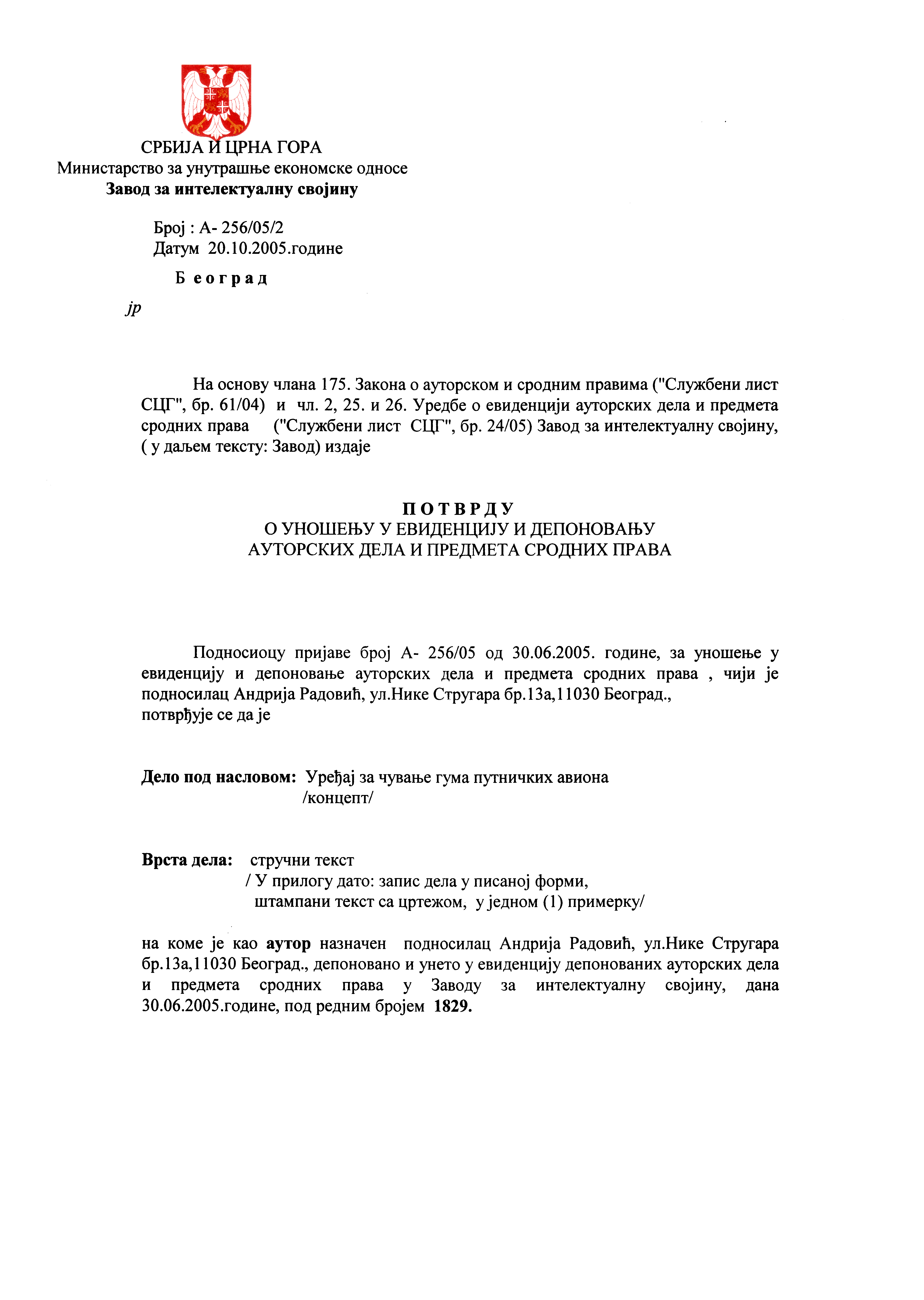 Copyright certificate in Serbian