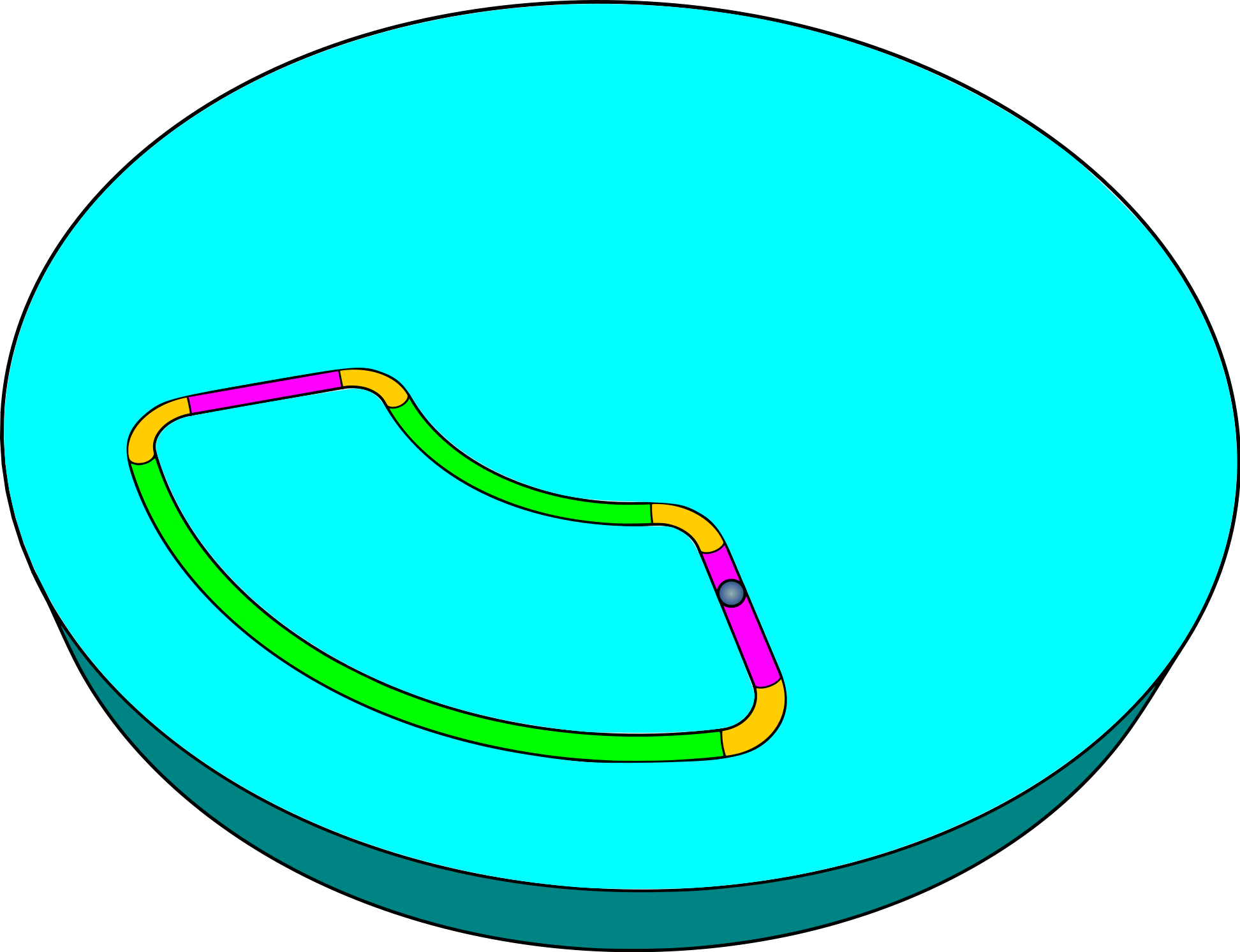 It is important here to be noticed that vc is not the velocity in the respect to the rotating platform as it is frequently citied in the available literature from the domain of the Classical Mechanics, but it is velocity in the respect of axis of rotation. The following figure depicts a groove with a grey ball moving inside it with the constant speed v0 on the rotating bluish disk. The groove contains green, purple and orange sections of the path and the Coriolis force appears only on trajectory in the purple sections of the groove because only in this section relative velocity to the respect of the center of rotation is not trivial, i.e. different than zero as it is case with green sections: