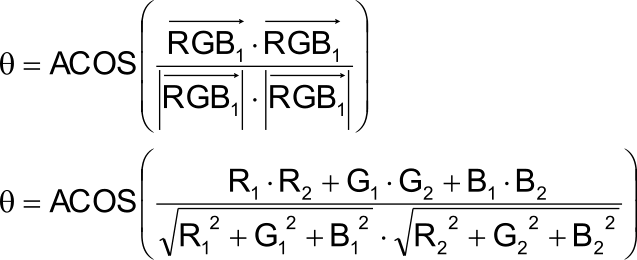 The existence of such color space gives us ability to establish criterion of similarity between two colors. The basic criterion of color similarities should be angle θ. Therefore we may consider two colors similar regardless their mutual intensities if the angle between their vectors in RGB space is small enough. Angle θ between two color vectors in RGB space is: