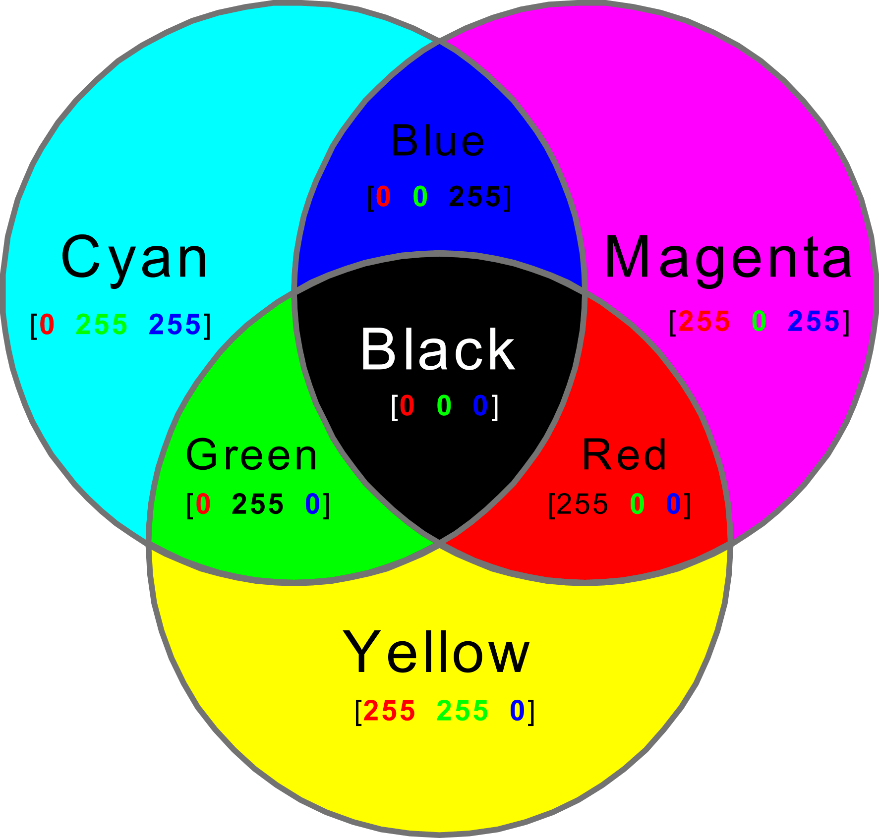 Primary luminescent colors are red, green and blue and those colors are shining colors, i.e. colors of light sources. The primary object’s colors are absorptive ones; they are cyan, magenta and yellow, sometimes with added black k color. Those three essential colors (with added nonessential k one) simply absorb parts of spectrum reflecting only certain light frequencies of preferred color.