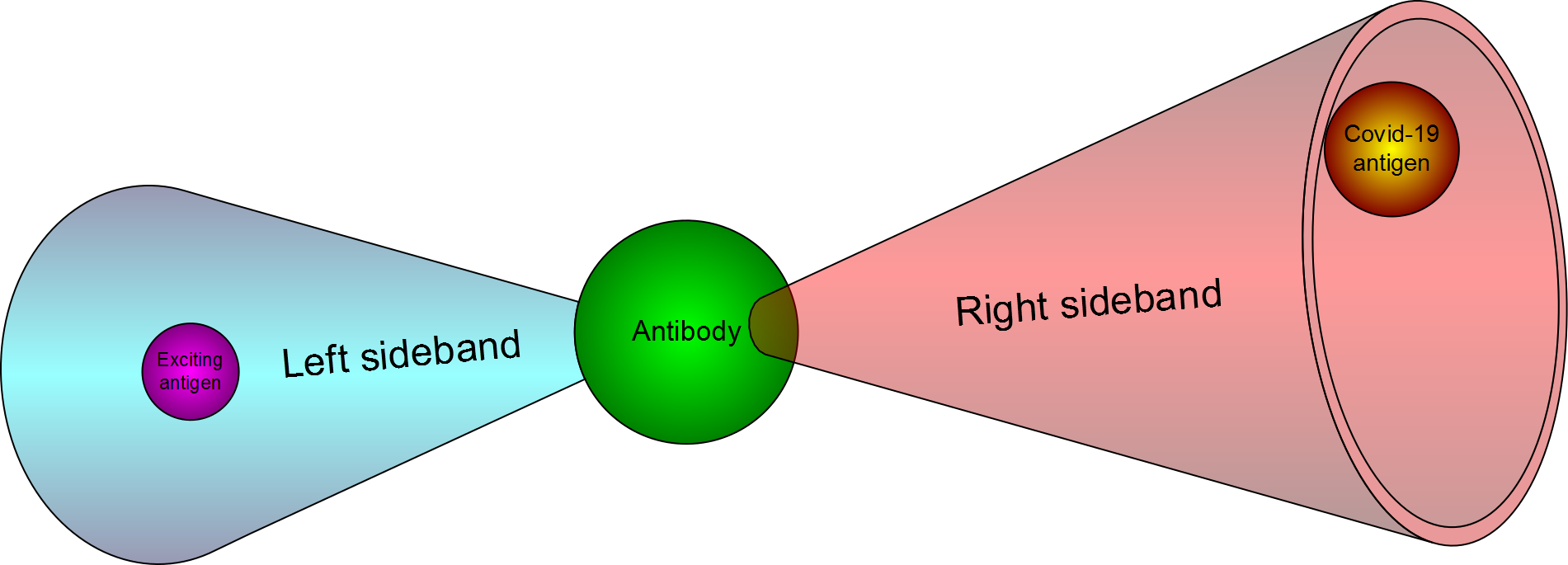 There is a question whether antibodies obtained on this way is more durable than ones obtained by the genuine Covid-19 viruses and the proper answer is - no. Both sidebands provoke creation of identical antibody. Above image depicts situation in which every single antibody has two cones of actions in generalized immune space and if the immune system is excited by the antigen in the unnatural left sideband it will create antibodies identical to one as provoked by real Covid-19 virus in right cone, in much bigger quantity, but with the same short time durability. This approach gives us chance to instigate antibodies creation, but not to manage its quality.